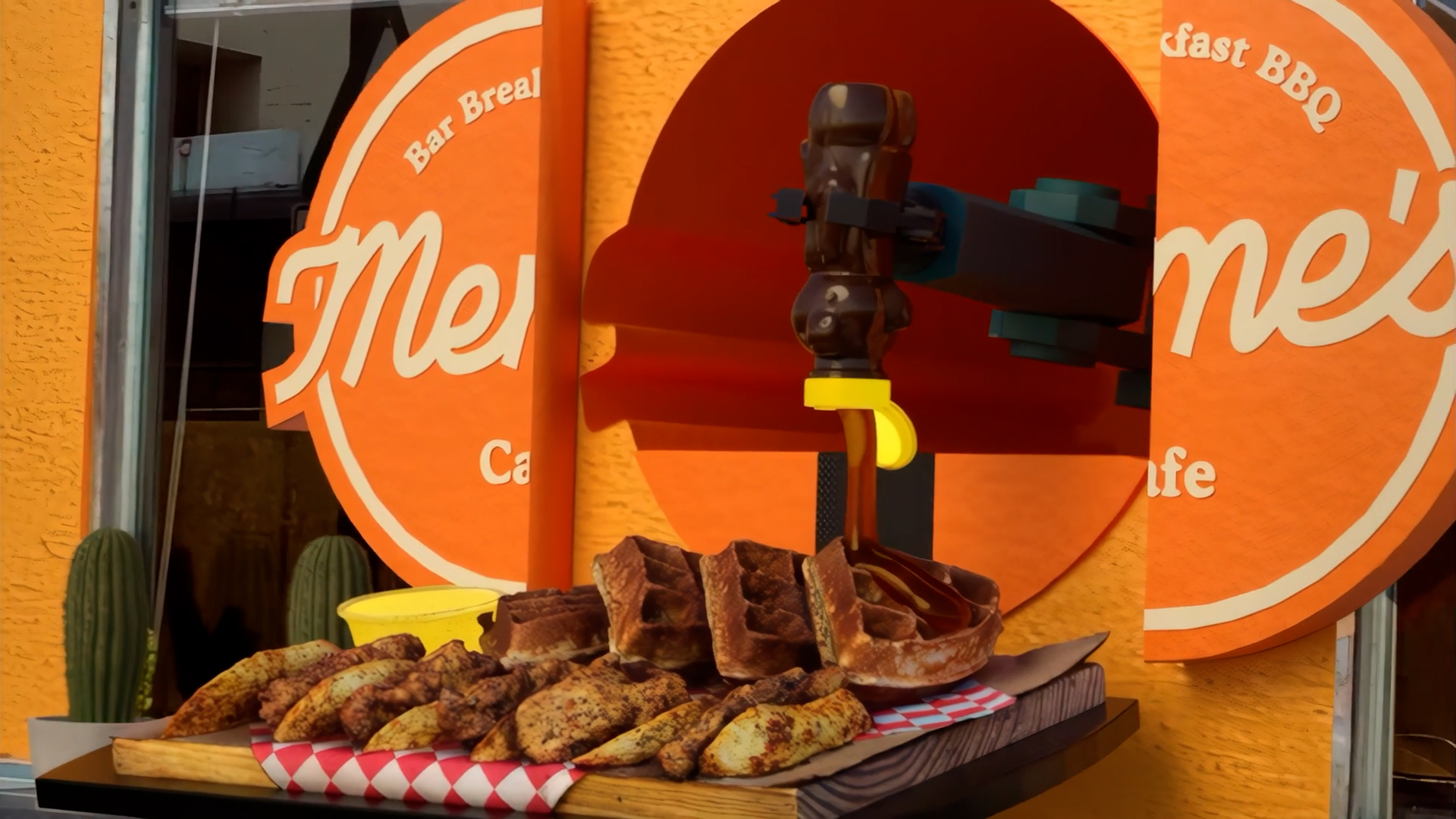 Este contenido FOOH convierte los icónicos Chicken n’ Waffles de Meme’s Café en los protagonistas de una escena inolvidable: emergen de una de las paredes del local bajo un brillante letrero de ‘Open 24 Hours’. Una propuesta visual impactante que refuerza el mensaje de que, sin importar la hora, Meme’s Café siempre está listo para servirte algo delicioso.
